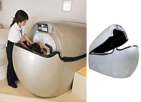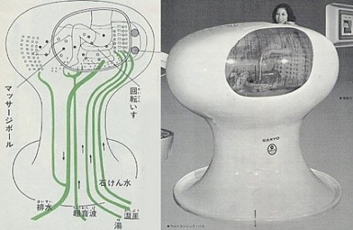 其實自動洗澡機早在上世紀七十年代就已經出現了。在1970年的日本大阪世博會上,的日本三洋公司就展示了這樣一款全自動超聲波洗澡機。這款產品外形酷似豆莢,使用者需要沿著梯子爬上去才能使用。