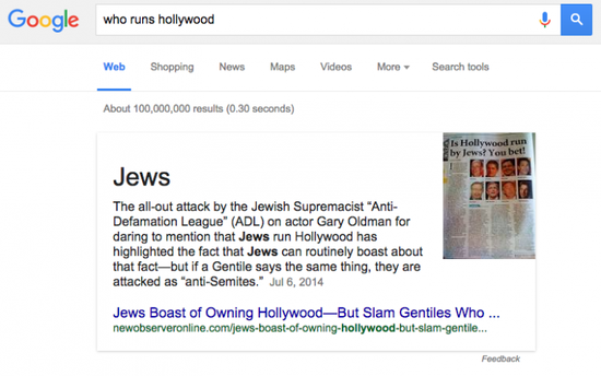 前兩天,當(dāng)有用戶使用谷歌搜索“who runs Hollywood”(誰(shuí)控制著好萊塢)時(shí),谷歌給出答案是“Jews”,這是一個(gè)具有種族主義色彩的用來(lái)稱呼猶太人的詞匯,另外該答案還指向了2014年的一篇來(lái)自New Observer的報(bào)道,而該媒體被普遍認(rèn)為是一家沒(méi)有節(jié)操的報(bào)道緋聞的小報(bào),其報(bào)道的主題還包括“非白種人入侵歐洲”和“第三世界的盲流”等,當(dāng)然也包含大量的反猶文章。而在該事件在西方世界掀起爭(zhēng)議之后,谷歌就已經(jīng)修改了這項(xiàng)搜索結(jié)果。谷歌的一位發(fā)言人稱:“我們很快就移除了這個(gè)答案。我們可以保證谷歌并沒(méi)有給予這樣的網(wǎng)站任何支持。”