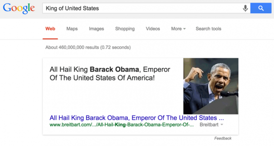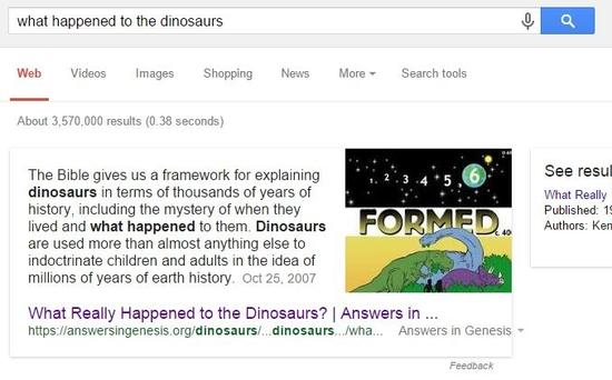 實(shí)際上,這已經(jīng)不是Direct Answers第一次鬧烏龍了,前段時(shí)間有幾天當(dāng)用戶搜索“what happened to the dinosaurs”(恐龍?jiān)庥隽耸裁?時(shí),谷歌給出的答案稱《圣經(jīng)》給出了解釋,而恐龍只是用來(lái)灌輸?shù)厍蛴袛?shù)十億年歷史想法的工具。那一次也是爭(zhēng)議頗多。