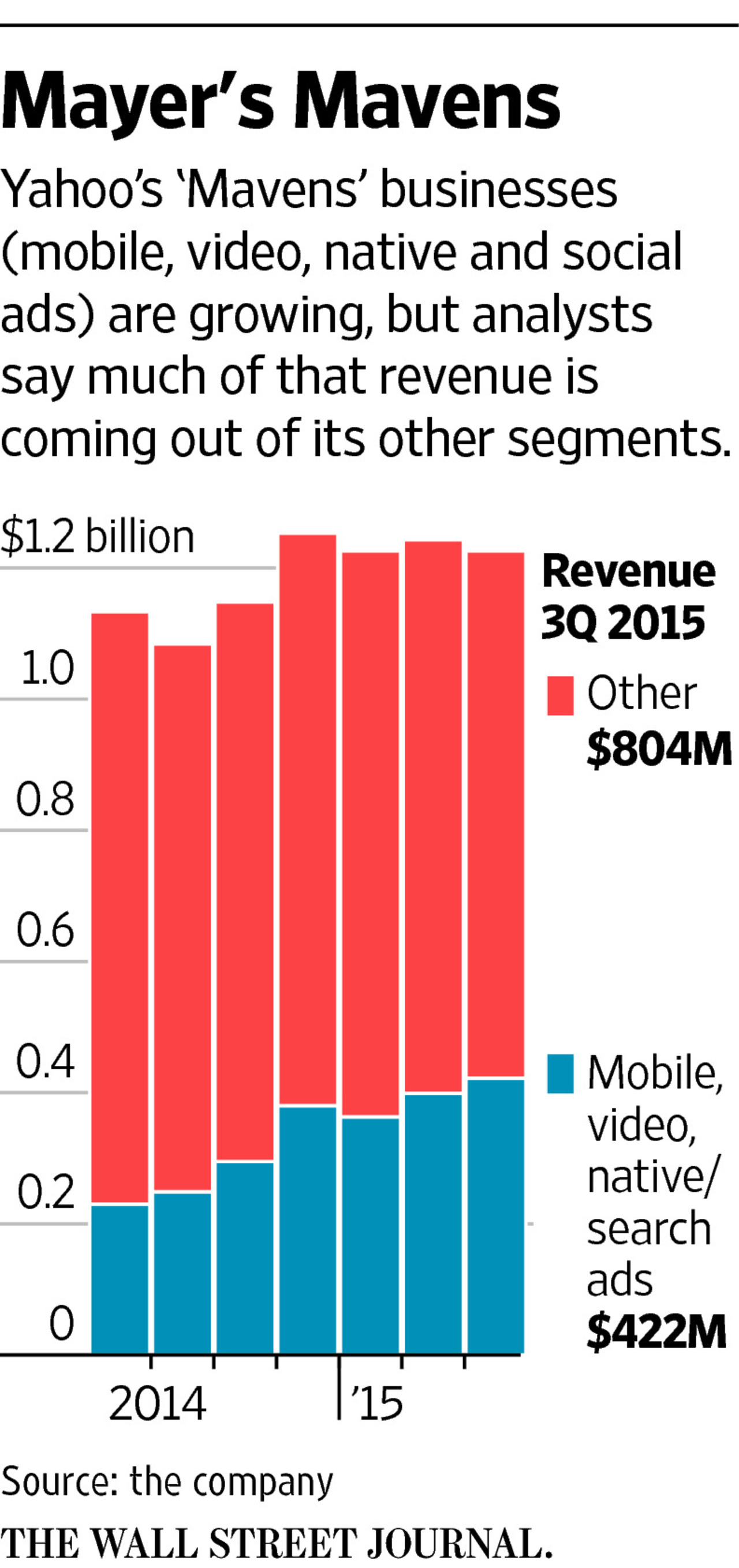 據與梅耶爾有密切工作關系的人稱,在必須披露壞消息時,她會顧左右而言他,放出其他吸引人的消息,分散人們的注意力。例如,建立Mavens業務部門,其中包括移動、視頻、原生和社交廣告業務,但不包括PC展示廣告業務。分析師稱,Mavens營收的增長是以犧牲雅虎桌面業務為代價的。