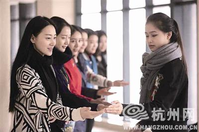 來自傳媒學院的志愿者正在進行禮儀培訓。 通訊員 沈志成 攝