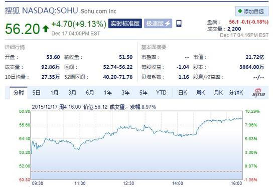 新浪科技訊 北京時間12月18日凌晨消息,搜狐(Nasdaq:SOHU)周四收盤股價大漲9.13%報56.2美元。