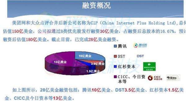 美團(tuán)點(diǎn)評28億美元融資中,包括國內(nèi)一家互聯(lián)網(wǎng)巨頭的10億美元投資,另外,DST投了3.5億美元,紅杉資本投資1.5億美元、CICC及今日資本等一共投資了13億美元。據(jù)知情人士透露,美團(tuán)點(diǎn)評還在繼續(xù)融資,最終融資金額會超過30億美元。