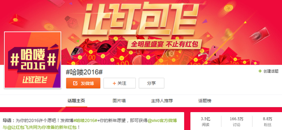 跨年期間,相關微博互動量達1.38億,2947萬用戶發布4414萬條微博,整體閱讀量達到106億。微博推出的#哈嘍2016#新年許愿活動,兩天里收集了166萬多條網友的新年愿望,閱讀量超過3億。