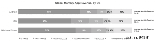 不過,WP平臺的收入剪刀差比較嚴重,能達到10000美元的比例是49%,低于iOS(53%),然而高于Android43%。