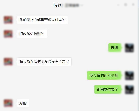 除了朋友圈里的怨聲載道,小編從其它微商朋友中也了解到,幾乎全部的供貨、發(fā)貨商都已在29日提前發(fā)布公告,稱不再接受微信轉賬,改用支付寶。“因為供貨幾乎都是萬元以上的交易。”之前的時候,即使微信轉賬2萬以上才收費,大家也都優(yōu)先微信,用完2萬額度以后再移步到支付寶。今后的話,“直接就全部用支付寶交易了。微信徹底免了。”做化妝品代購的小蘇說。