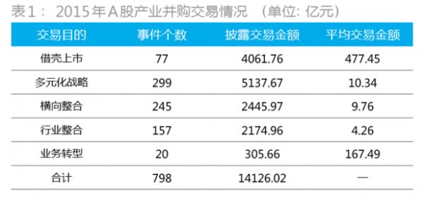 產業并購,以傳統的工業思維方式來看,就是產業鏈上下游整合或者產業橫向整合,以時髦的互聯網思維方式來看,就是從用戶出發,整合企業以滿足用戶需求的“生態圈”。無論是哪一種方式,都被A股上市公司嫻熟地加以運用。據統計,2015年A股產業并購的交易額接近1.5萬億元,占全年2.2萬億元交易額的68%以上(表1)。