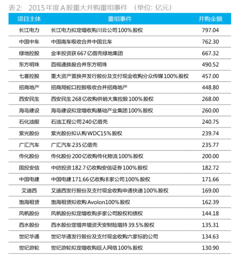 產業并購的火爆,反映的是中國經濟結構轉型升級的內在需求,這里面既有產業整合,逐步形成寡頭格局的行業發展規律,更有形成中國“創造”的發展動力;不僅中小板和創業板的企業積極參與進來,出現了很多十億、百億級別的并購整合,而且很多大型國企也積極投身于這場大潮。比如,引爆A股火熱行情的中國南車、北車合并,中國五礦和中國中冶的合并,招商蛇口和招商地產合并等,都是百億乃至千億以上規模的整合。想必在2016、2017年產業整合的大戲還將繼續上演(表2)。