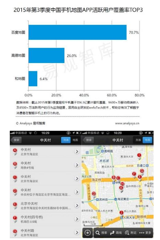 2015年中,百度地圖決定將為全行業的企業進行地理標簽,確保移動導航服務。任何企業都能在百度地圖上標注企業信息,當網民在百度地圖搜索時即可看到該企業的展示的基本信息,如企業名稱、地址、聯系方式、交通等。2015年第3季度,百度地圖以70.7%的活躍用戶覆蓋率領跑中國手機地圖市場,成為當之無愧的地圖老大。無論是在移動端還是PC端,位置服務已經成為百度地圖的亮點之一,百度地圖也與寶馬、比亞迪等品牌聯手,為車載導航提供出行路線規劃或生活信息查找,令汽車也和手機、平板電腦一樣,成為一個智能終端。百度地圖愈發成為百度同阿里(高德地圖)和騰訊(騰訊地圖)之間競爭的利器。