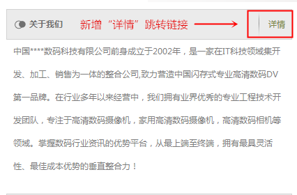 該模塊新增“詳情”跳轉鏈接,便于用戶點擊,瀏覽關于企業的更多品牌介紹。商家可在后臺點擊“自定義頁面”,進入“關于我們”,自主添加企業介紹(包括顯示在主頁面的簡短描述,以及二級頁面的詳情介紹)。