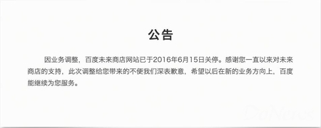 有用戶反映,百度未來(lái)商店自3月份以來(lái)就基本停止了更新,但官方一直沒(méi)有對(duì)外解釋,也沒(méi)有關(guān)停的傳聞。17日上午,百度未來(lái)商店網(wǎng)站貼出公告,稱網(wǎng)站已于 2016 年 6 月 15 日關(guān)停。
