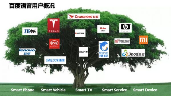 目前,使用百度語音的App數量8萬+,每天語音識別請求量1億+,每天語音合成請求量2.5億+。重量級行業用戶包括智能手機領域的聯想、中興、魅族等;智能家居領域的聯想、康佳、SONY等;汽車行業的特斯拉、比亞迪等;智能設備領域的惠普、三諾、艾米通訊等。
