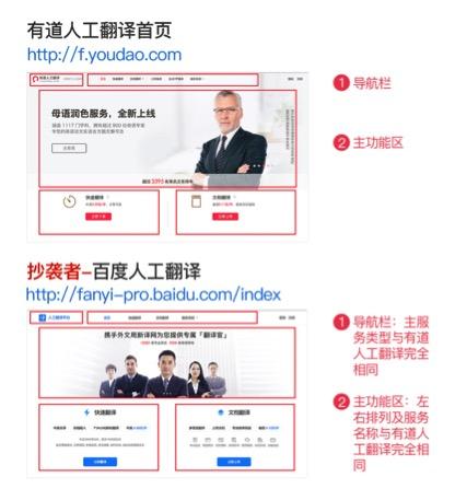 二、 有道認(rèn)為,百度人工翻譯的“快速翻譯”和“文檔翻譯”等多項(xiàng)服務(wù)完全照搬了有道人工翻譯,包括服務(wù)流程、界面設(shè)計(jì)和頁面文案;甚至連有道人工翻譯在翻譯輸入框中對用戶的提示文案都照抄不誤。