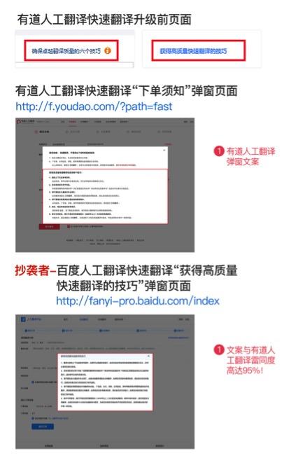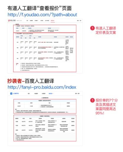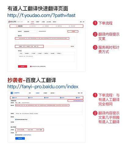 有道人工翻譯在2011年上線【快速翻譯】和【文檔翻譯】兩種服務(wù),并于2015年首次推出【7*24小時(shí)】的服務(wù)理念,而7月6日上線的百度人工翻譯不僅只字未改,完全照搬了有道兩檔服務(wù)類型和7*24小時(shí)的服務(wù)理念。