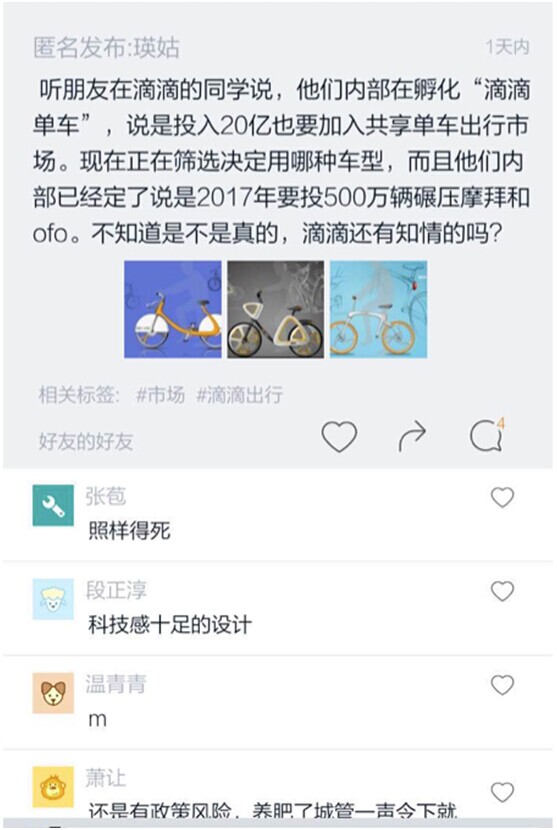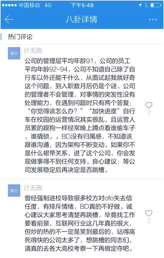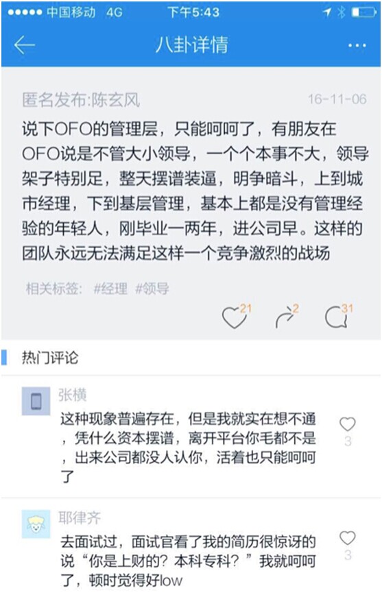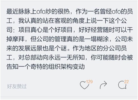 最近,脈脈上傳來不少OFO內(nèi)部知情人士的消息:大意是說OFO的團(tuán)隊管理不善,內(nèi)部架構(gòu)一塌糊涂之類的,有圖有真相。