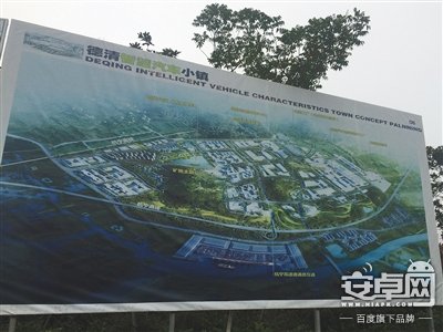 十字路口另一側(cè),豎立著三塊巨大的項(xiàng)目展板,其中一塊名為“德清智慧汽車(chē)小鎮(zhèn)”。在這塊展示板上,印著高新區(qū)的布局,包括智慧汽車(chē)制造整車(chē)工廠和智慧物流港等內(nèi)容。