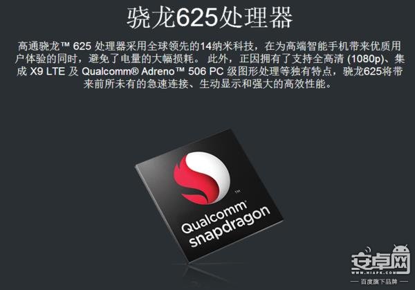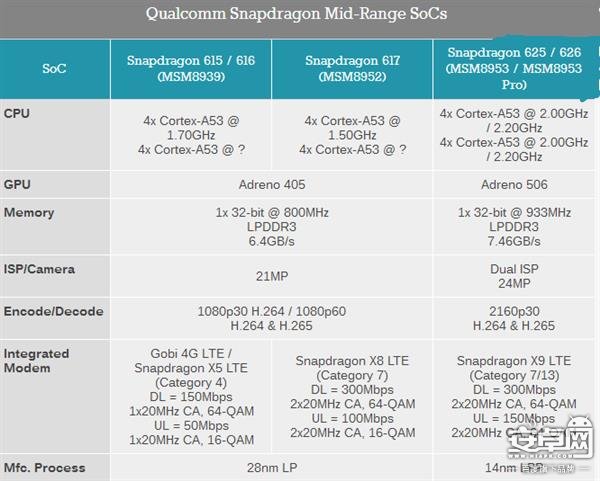 驍龍626:代號MSM8953 Pro,也就是625的升級版,主頻從2GHz提升到2.2GHz,基帶升級為LTE X9,支持藍牙4.2,其他參數基本一致,采用14nm制程,支持QC3.0快充。