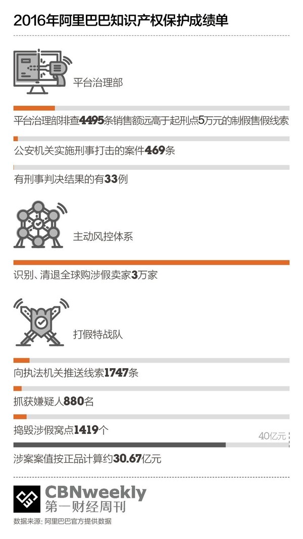 2015年年底,阿里巴巴成立平臺(tái)治理部,把原本散落在各個(gè)部門、負(fù)責(zé)知識(shí)產(chǎn)權(quán)保護(hù)的人員整合到新部門,統(tǒng)一管理和決策。平臺(tái)治理部下面包括了知識(shí)產(chǎn)權(quán)保護(hù)團(tuán)隊(duì)、主動(dòng)風(fēng)控團(tuán)隊(duì)、治理劣質(zhì)商品的商品管理團(tuán)隊(duì)和治理炒信的團(tuán)隊(duì)。