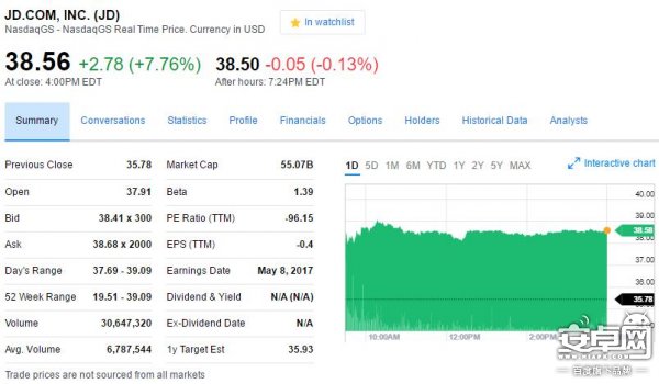 在發布靚麗的財報后,京東股價周一也水漲船高,大漲7.7%至38.56美元,創下歷史新高。今年以來,京東股價已大漲40%。競爭對手阿里巴巴股價周一小幅上漲0.75%,該公司將于本月18日發布季度財報。