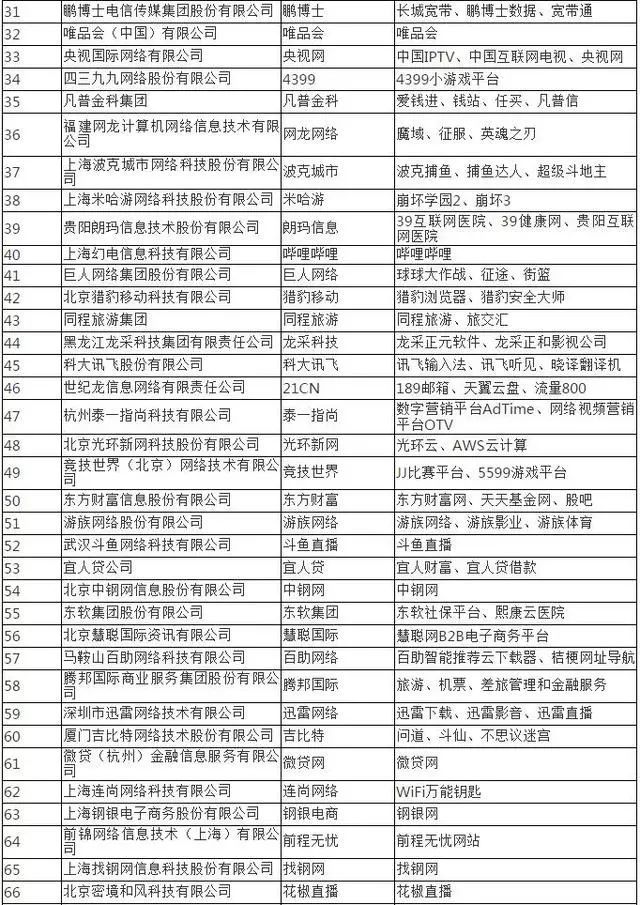 入圍前十的企業(yè)分別是:阿里巴巴集團、深圳市騰訊計算機系統(tǒng)有限公司、百度公司、京東集團、網(wǎng)易集團、新浪公司、搜狐公司、美團點評集團、三六零科技有限公司、小米集團。