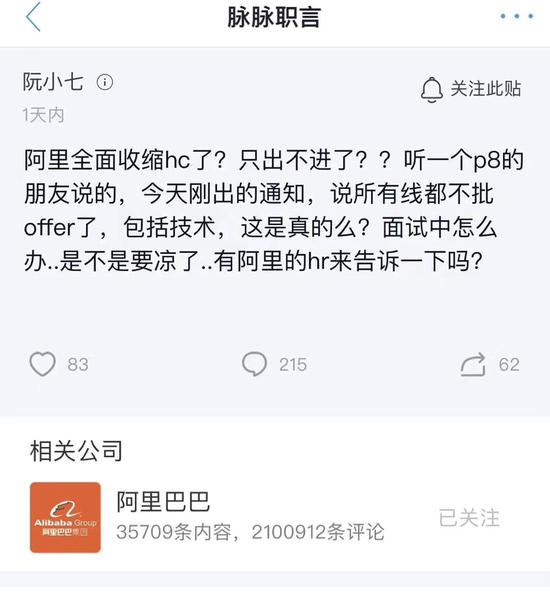 近日,有應聘者在職場社交應用脈脈上留言表示:阿里已全面縮減headcount(人員編制),所有業(yè)務線都不批offer,包括技術,近期招不上來的可能就會被砍掉了。