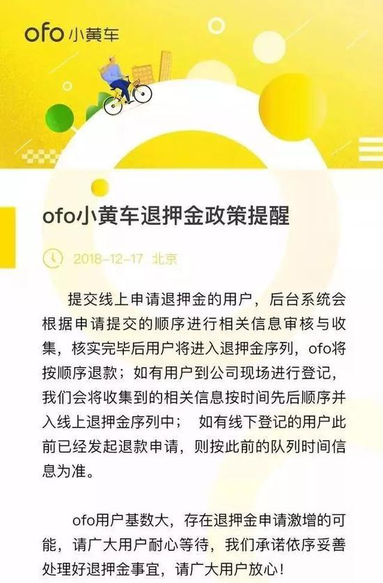 迫于壓力,ofo今日晚間在官微發布公告稱,自2018年12月18日起,凡在App內提交線上申請退押金的用戶,后臺系統會根據申請提交的順序進行相關信息審核與收集,核實完畢后用戶將進入退押金序列,ofo將按順序退款。