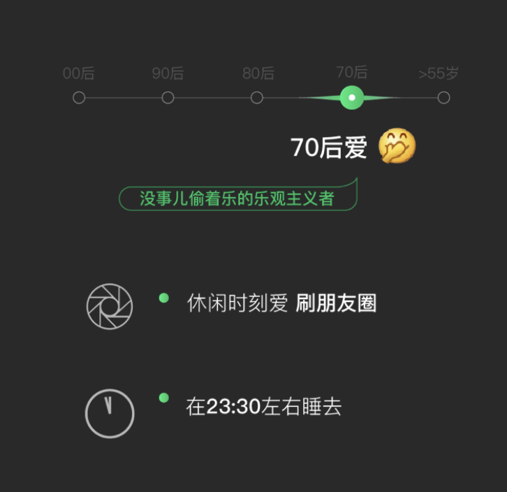 70后最愛的表情則是“偷笑”,他們休閑時刻最愛刷朋友圈,每天在23點30分左右入睡。