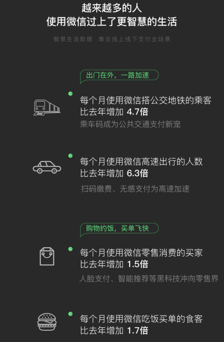 在智慧生活方面,每個月使用微信搭公交地鐵的乘客比去年增加了4.7倍,每個月使用微信高速出行的人數比去年增加6.3倍,掃碼繳費、無感支付正在為高速加速。