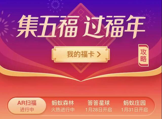 1月25日起,在手機(jī)中打開支付寶APP,在首頁醒目位置就可以看到“五福到 新年到”活動(dòng)入口,點(diǎn)擊進(jìn)入就可以看到集五福,過福年活動(dòng)攻略頁面。