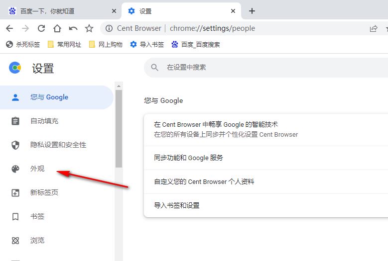 3、進入設置頁面之后,我們在左側列表中找到“外觀”選項,點擊打開該選項