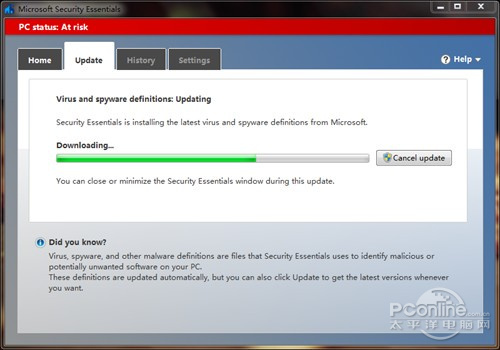 安裝完畢會首先進(jìn)入更新檢查,這已經(jīng)是 MSE 的老傳統(tǒng)了,目的是下載一個完整的病毒庫。從筆者的實測情況來看,速度依舊不夠給力(電信 4M ADSL),整個過程中基本維持在 60Kbps 左右,而且并不平穩(wěn),大約過了 20 分鐘更新才告結(jié)束。最終,更新后的程序版本為 4.0.1111.0。