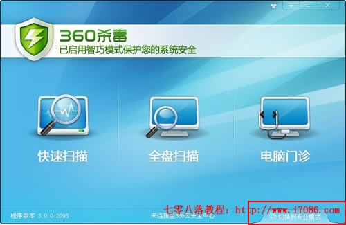 1.現(xiàn)在大家打開您的360殺毒軟件界面,選擇切換到專業(yè)模式。