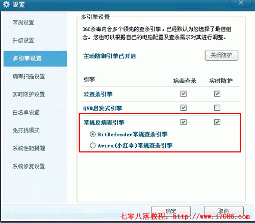 3.選擇Avira(小紅傘)常規(guī)查殺引擎或者BitDefender常規(guī)查殺引擎,同時勾選病毒查殺和實時防護。確定后殺毒軟件會立即更新文件!