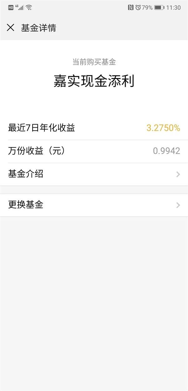 目前,零錢通默認(rèn)接入的是嘉實(shí)現(xiàn)金添利基金,最近7日年化收益率為3.275%,萬份受益0.9942元。照此計(jì)算,存10萬元一天大約收益近10元。