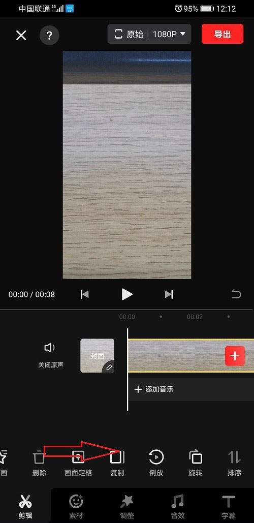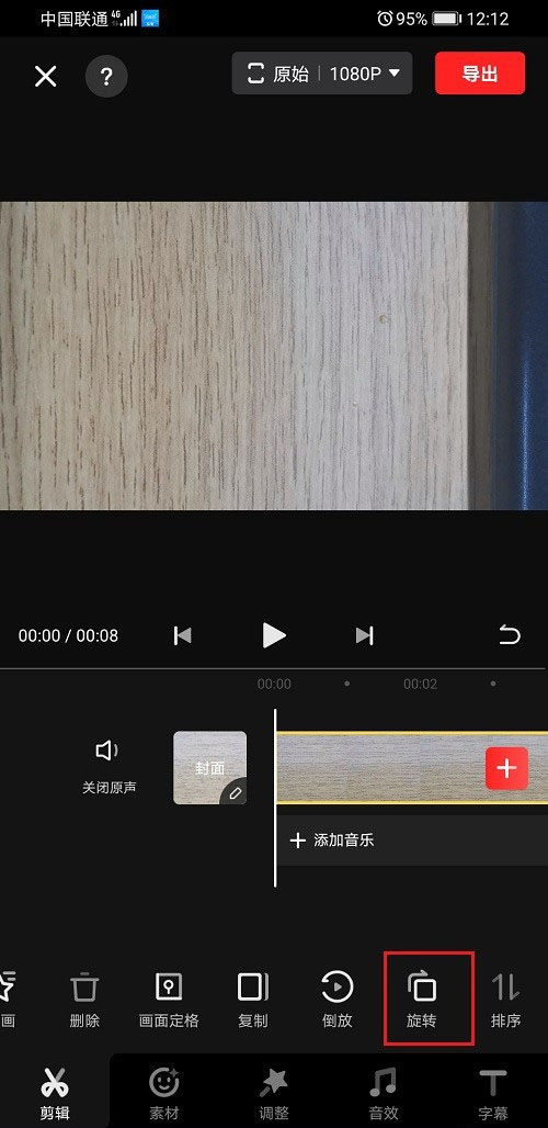 3、進去視頻剪輯界面,向右滑動,找到旋轉(zhuǎn),如下圖所示: