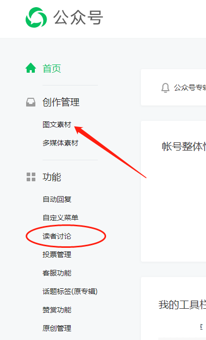 2、登入你的公眾號,看到多了【讀者討論】的功能,我們點擊【圖文素材】