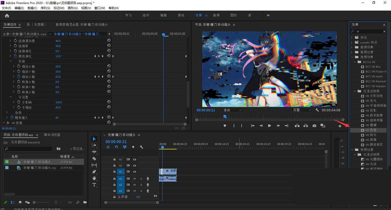 5、搜索vr 色差,拖到素材上。