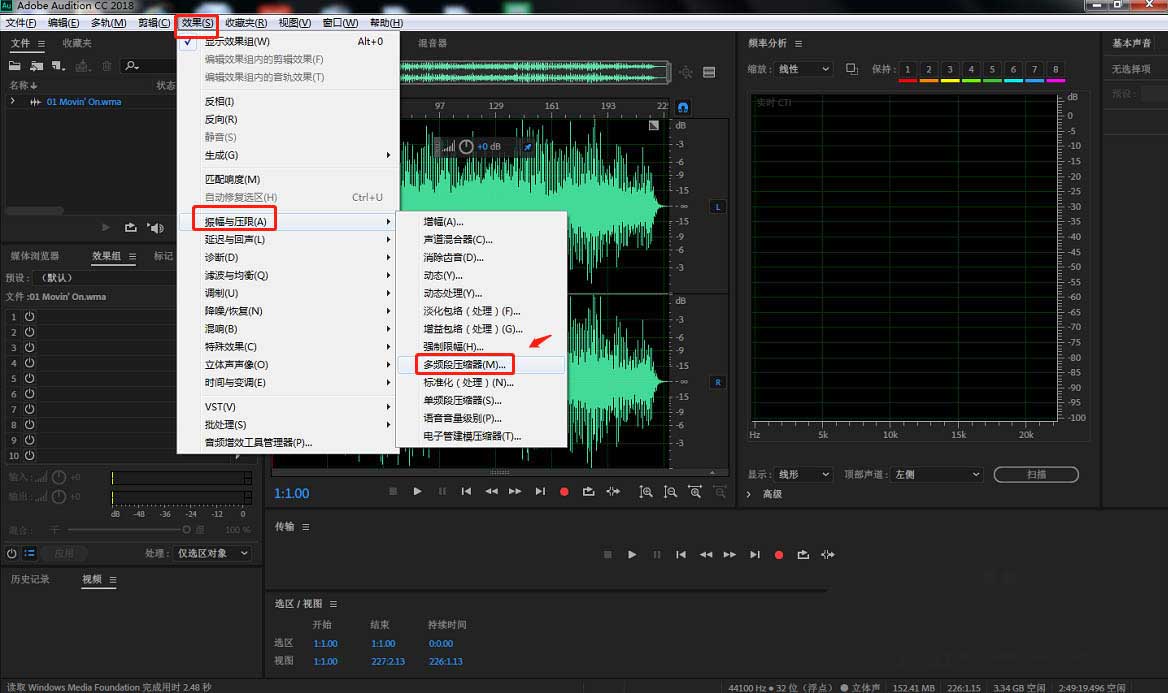 4、點擊頂部工具欄中的“效果”——“振幅與壓限”——“多頻段壓縮器”。