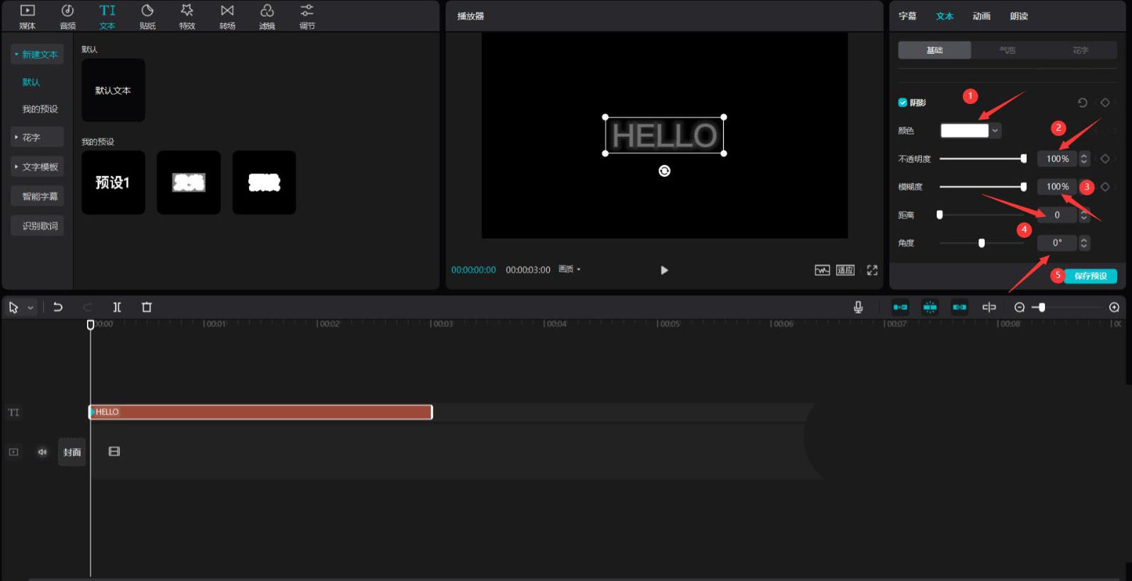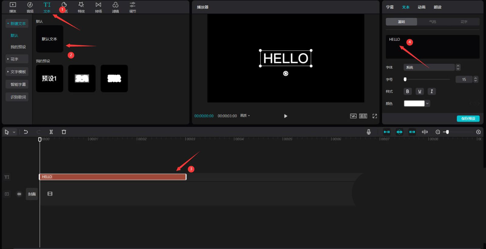 點(diǎn)擊文本按鈕,選擇默認(rèn)文本,將其添加到文本軌道中,然后更改文本內(nèi)容為你想展示的內(nèi)容,見下圖。