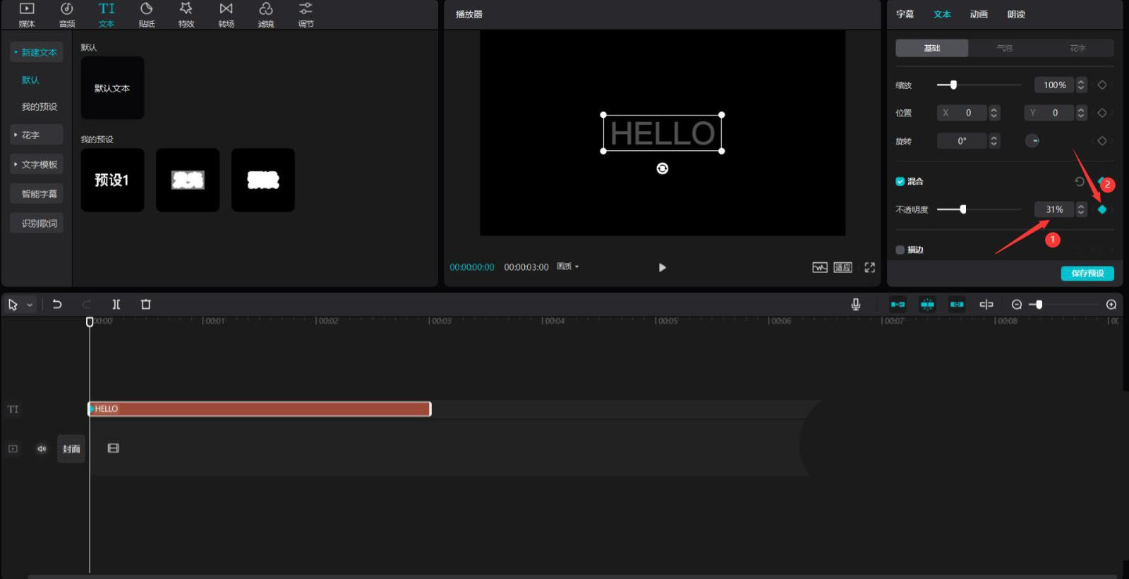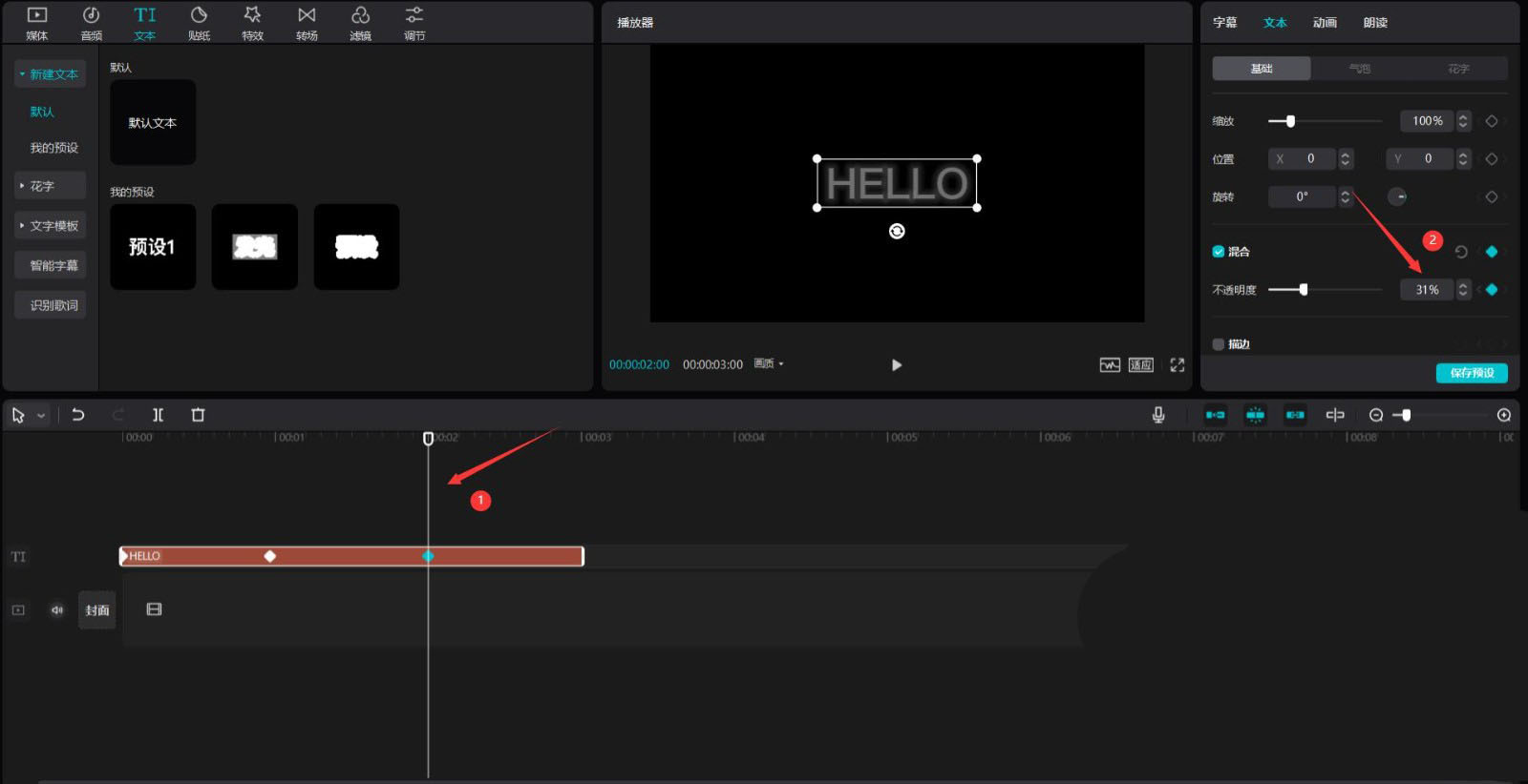 將時(shí)間軸移動(dòng)到2秒處,更改不透明度為31%,見下圖。