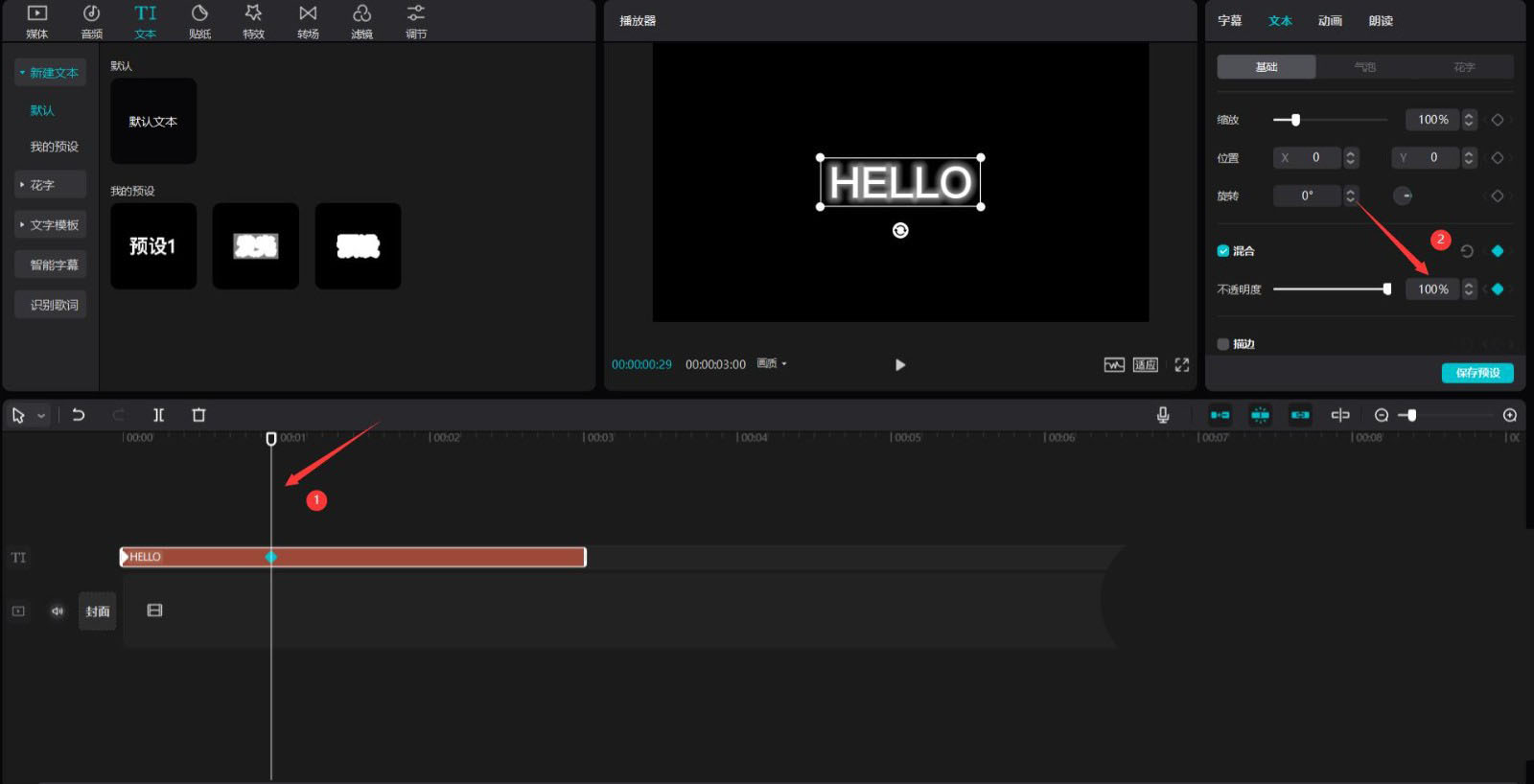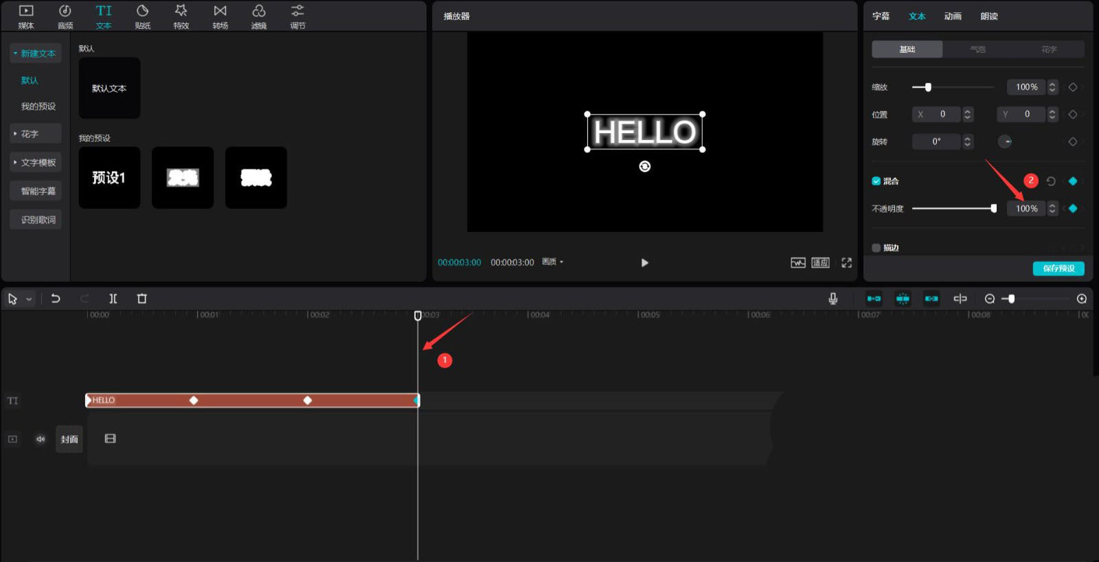 將時(shí)間軸移動(dòng)到1秒處,更改不透明度為100%,見下圖。