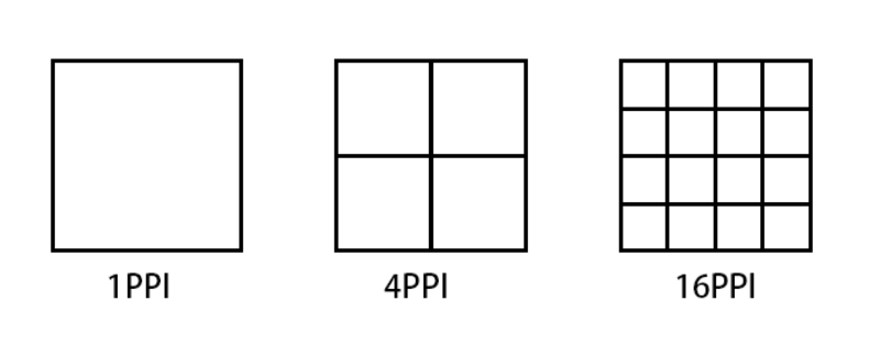 越高PPI的屏幕,顯示一個像素點的面積就越小,一張由4x4個像素點組成的圖顯示在PPI為64的屏幕上,那么換到256PPI的屏幕上顯示則會縮小為原來大小的一半。