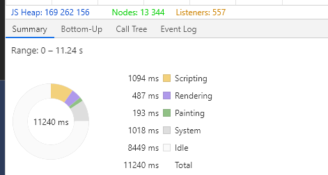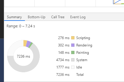 在完成這個動動畫效果之后遇到一個至今原因不明的bug,隨著屏幕放置時間的變長,動畫越來越慢,打開任務管理器,未見內存泄漏或者CPU使用率過高。打開performance,發現頁面調幀嚴重,屏幕幀數越來越低,單個Frame CPU time越來越長,范圍來看,script和render和paint耗時未發生線性變化,只有system時間越來越來長,越來越長,期望能被大佬告知原因
